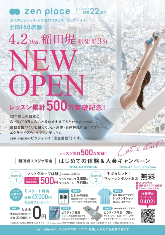 毎日をちょっと変えたいあなたへ!JR稲田堤駅徒歩3分に「zen place pilates」新オープンで心と体に新しい風を