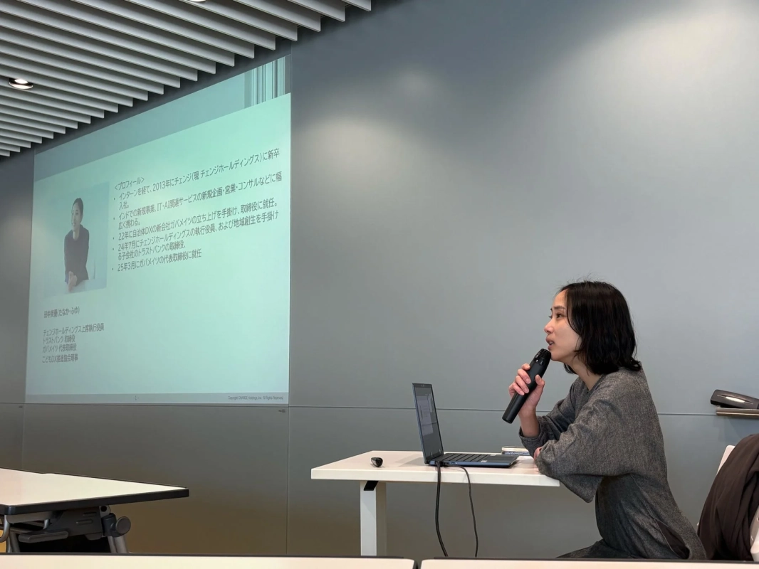 2026年3月14日、大妻女子大学千代田キャンパスで開催された「WUSIC 春休みプロジェクト発表会2026」では、株式会社チェンジホールディングスの上席執行役員である田中芙優氏が基調講演を行いました。チェンジホールディングスは、自治体DXや官民連携を通じて社会課題解決に取り組んでおり、WUSICの理念と方向性が一致することから、今回の登壇が実現したそうです。