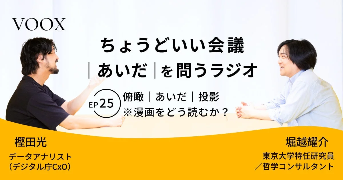 今回配信された最新エピソード『Ep25: 俯瞰|あいだ|投影 ※漫画をどう読むか?』では、「漫画をどう読むか?」という身近なテーマから、「あいだ」の奥深さに迫ります。例えば、こんな話題が飛び出すそうですよ。